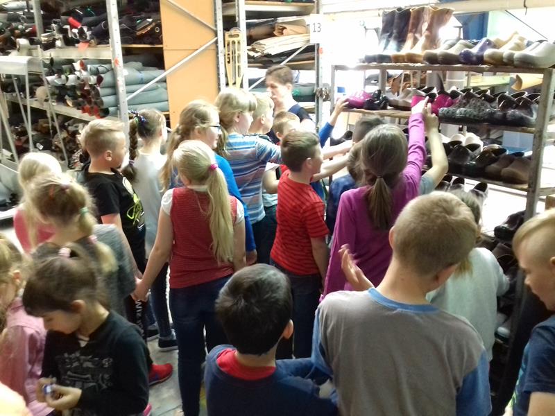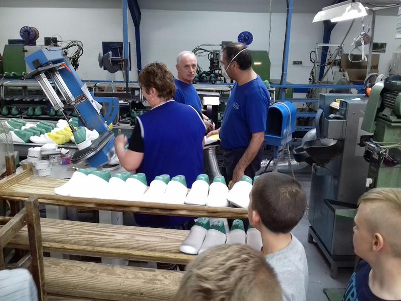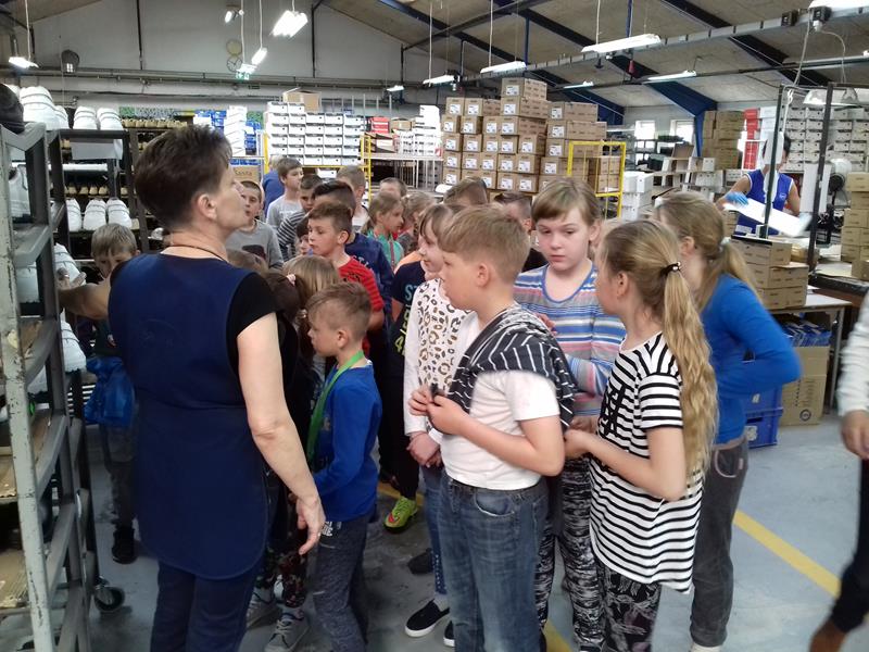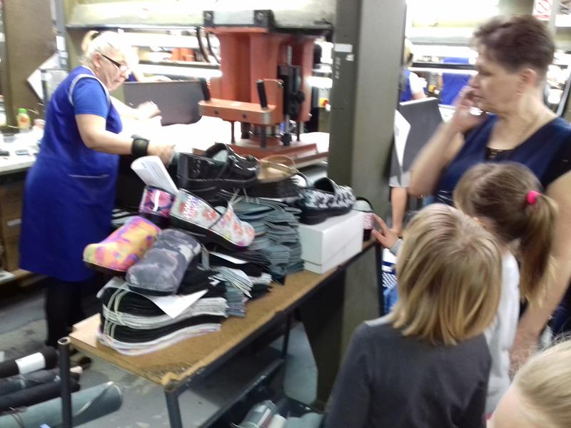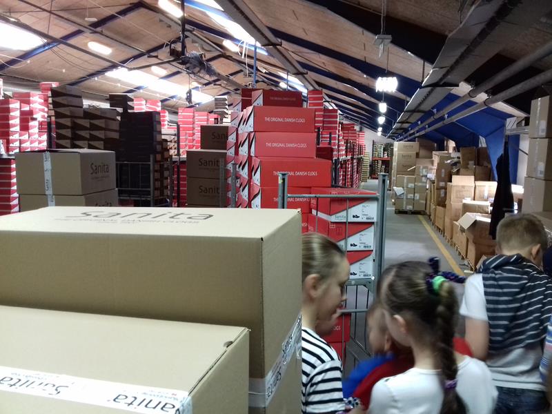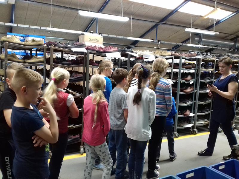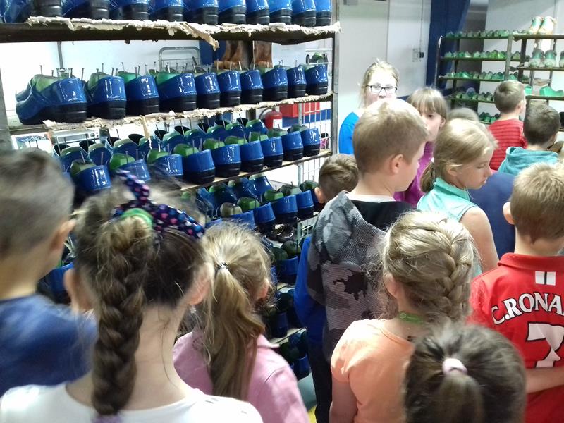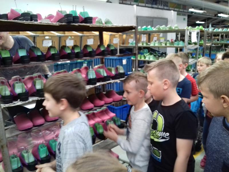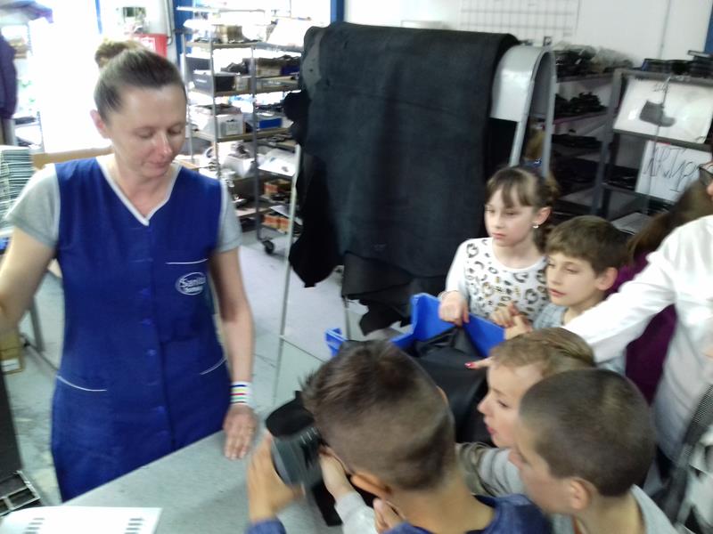 Możliwość zwiedzenia firmy zawdzięczamy jednej z mam – pani Katarzynie Pastuszka, która jest pracownikiem SANITY. Po halach produkcyjnych oprowadziła dzieci pani Basia. W magazynie skór uczniowie oglądali różnego rodzaju skóry, które cieszyły oczy swoimi bajecznymi, egzotycznymi wzorami i szeroką gamą barw. Skóry trafiają na krajalnię, następnie do szwalni. Wyprofilowane na kopytach, przymocowywane są do drewnianej podeszwy specjalnymi maszynami, po czym suszone w suszarni. Po sprawdzeniu jakości trafiają do pudełek, następnie do ogromnych kartonów i czekają w magazynie na eksport. Dziennie produkowanych jest tu 2300 par butów, przy produkcji których pracuje ok.170 osób. Te piękne chodaki trafiają m. in. do Danii, Szwecji, Holandii. Na pamiątkę spotkania uczniowie otrzymali skórzane próbki o różnych kształtach. Wrócili do szkoły bogatsi w wiedzę i bardzo zadowoleni. Serdecznie dziękujemy pani Katarzynie Pastuszka za zorganizowanie wspaniałej wycieczki.