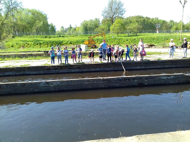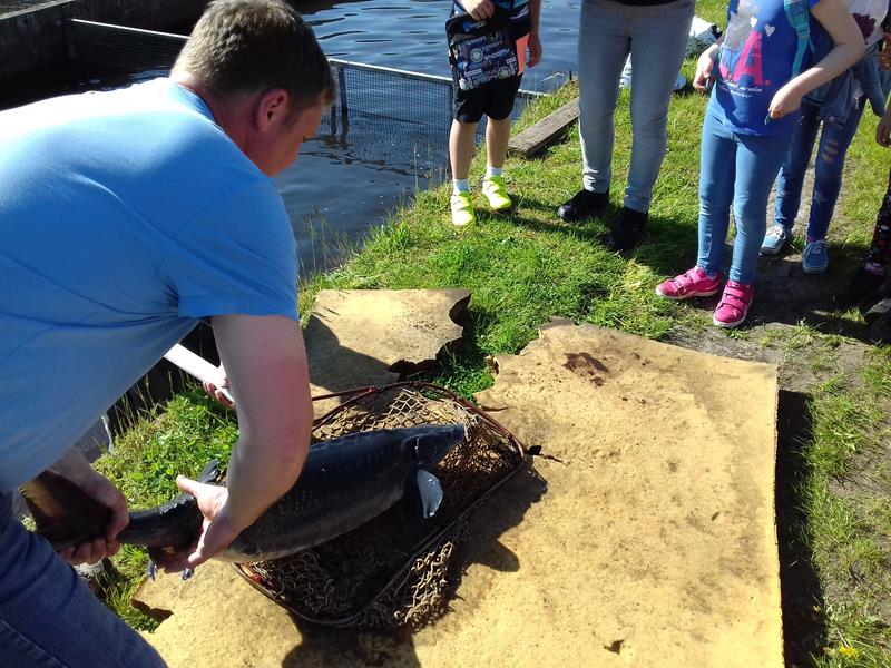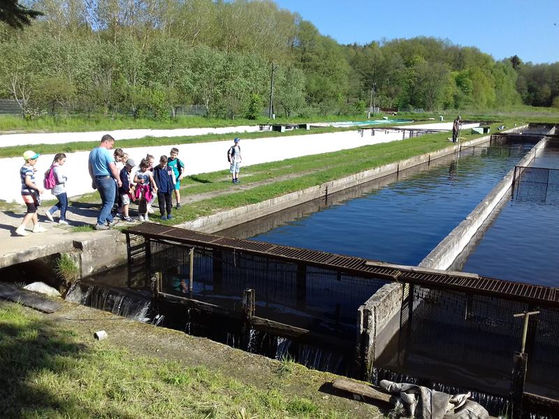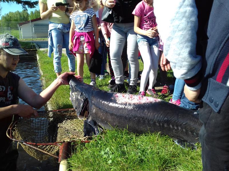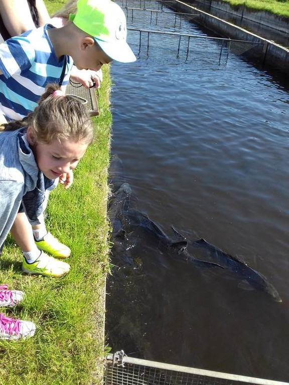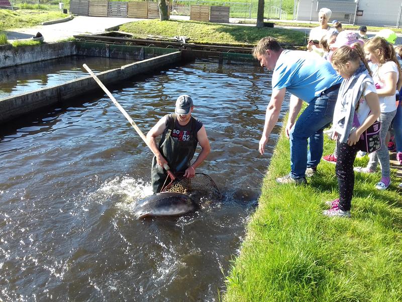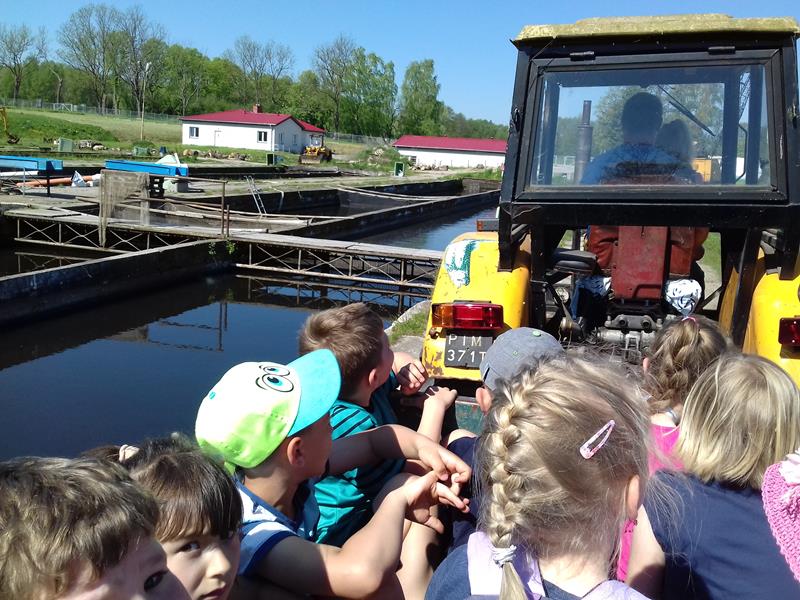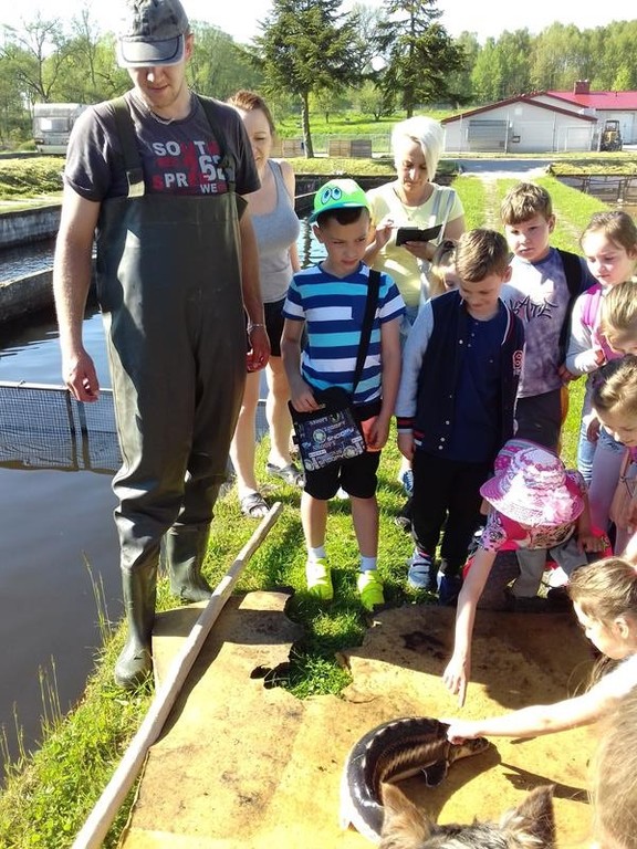 Po gospodarstwie oprowadził gości pan Maciej, który przekazał wiele ciekawostek na temat życia i hodowli ryb. Uczniowie mieli niecodzienną okazję podziwiać pstrągi tęczowe i potokowe oraz kilka gatunków ryb jesiotrowatych tj.: bieługi, jesiotry syberyjskie i rosyjskie, sterlety oraz siewrugi. Widzieli też węgorza, szczupaka, płocie. Brali czynny udział w karmieniu ryb, co sprawiło im ogromna frajdę. Po zwiedzeniu stawów pan Maciej zabrał dzieci na przejażdżkę traktorem. Majowa pogoda nie szczędziła promieni słońca, które dość szybko opaliły twarze uczestników wycieczki. Pełni emocji i ogrzani słońcem dotarli do miejsca, w którym pani Magda czekała z poczęstunkiem – ciastem drożdżowym i rybką. Degustacja świeżo wędzonej ryby miała na celu zachęcić dzieci do spożywania większej ilości ryb ze względu na ich wyjątkowe wartości odżywcze. Ryby zawierają wysokowartościowe białko, kwasy tłuszczowe omega 3, witaminy A i D, szereg składników mineralnych: jod, selen, fluor, magnez i wapń. Cel został osiągnięty, gdyż ryba znikała z talerzy w mgnieniu oka, a gospodarzom było bardzo miło z tego powodu. Wycieczka była wspaniała i bardzo interesująca. Sprawdziło się powiedzenie: „Cudze chwalicie , swego nie znacie”.