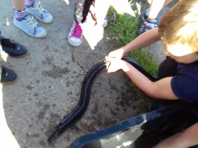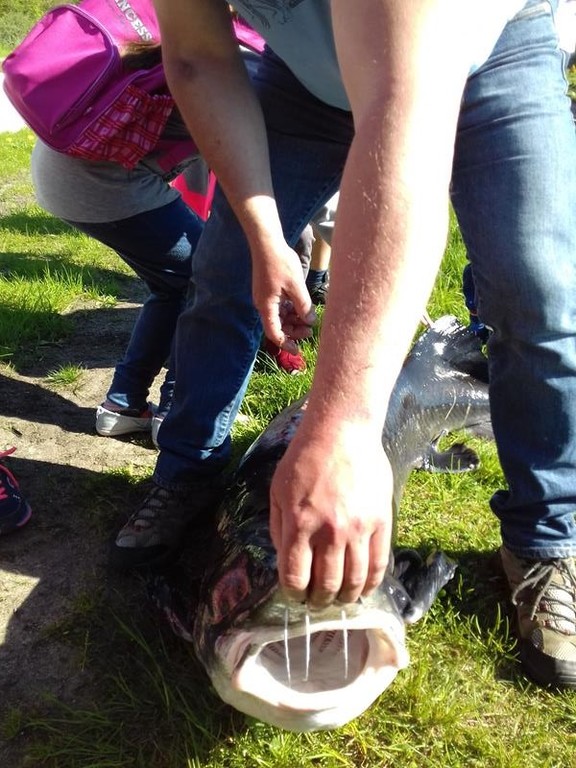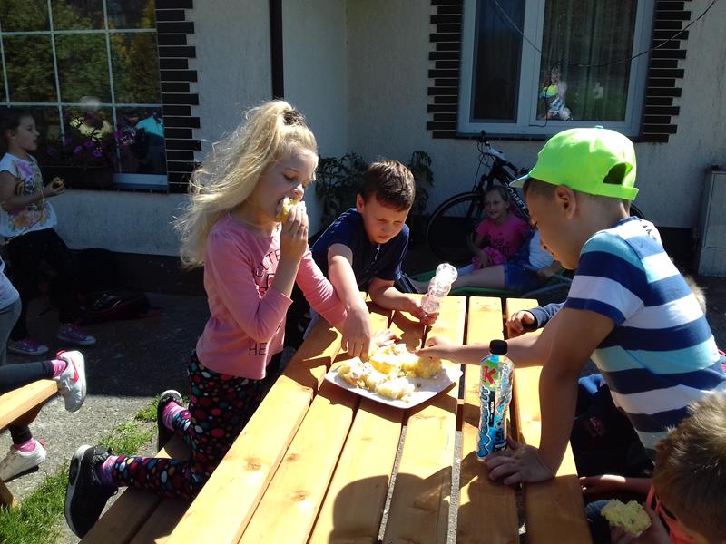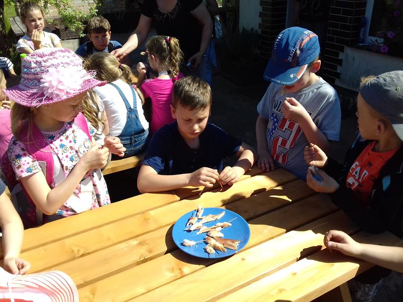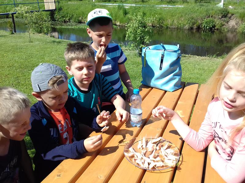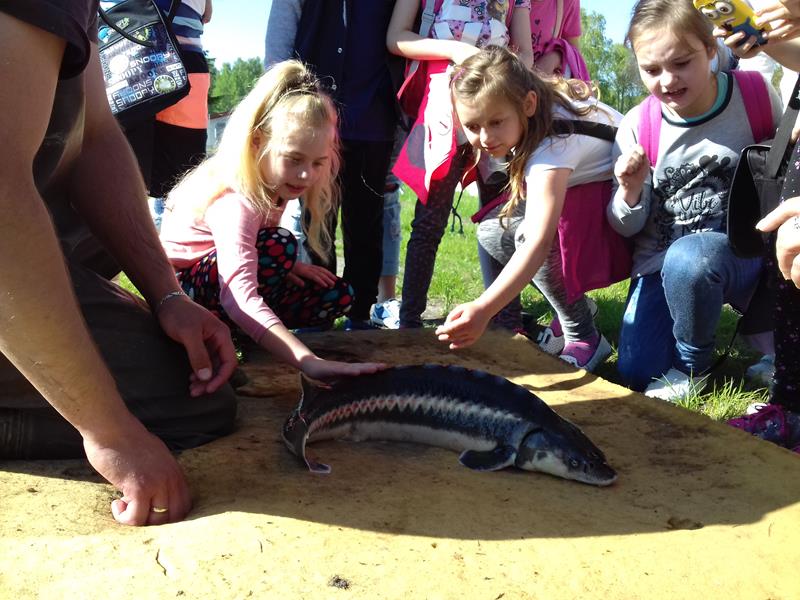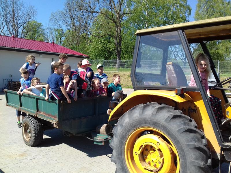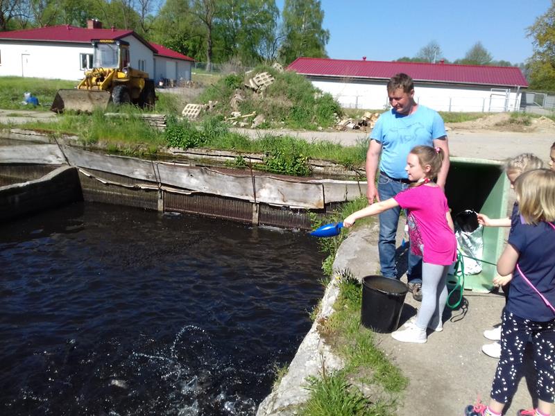 Po gospodarstwie oprowadził gości pan Maciej, który przekazał wiele ciekawostek na temat życia i hodowli ryb. Uczniowie mieli niecodzienną okazję podziwiać pstrągi tęczowe i potokowe oraz kilka gatunków ryb jesiotrowatych tj.: bieługi, jesiotry syberyjskie i rosyjskie, sterlety oraz siewrugi. Widzieli też węgorza, szczupaka, płocie. Brali czynny udział w karmieniu ryb, co sprawiło im ogromna frajdę. Po zwiedzeniu stawów pan Maciej zabrał dzieci na przejażdżkę traktorem. Majowa pogoda nie szczędziła promieni słońca, które dość szybko opaliły twarze uczestników wycieczki. Pełni emocji i ogrzani słońcem dotarli do miejsca, w którym pani Magda czekała z poczęstunkiem – ciastem drożdżowym i rybką. Degustacja świeżo wędzonej ryby miała na celu zachęcić dzieci do spożywania większej ilości ryb ze względu na ich wyjątkowe wartości odżywcze. Ryby zawierają wysokowartościowe białko, kwasy tłuszczowe omega 3, witaminy A i D, szereg składników mineralnych: jod, selen, fluor, magnez i wapń. Cel został osiągnięty, gdyż ryba znikała z talerzy w mgnieniu oka, a gospodarzom było bardzo miło z tego powodu. Wycieczka była wspaniała i bardzo interesująca. Sprawdziło się powiedzenie: „Cudze chwalicie , swego nie znacie”.