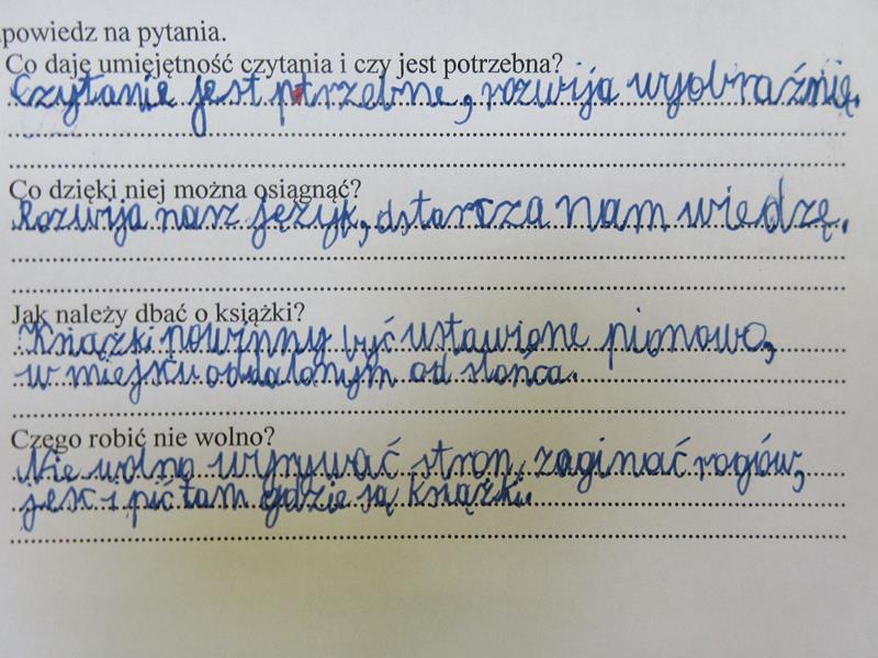 Dzieci korzystając z książek, rozwijają swoją wyobraźnię i zainteresowania, poznają więcej historii, poszerzają słownictwo, rozwijają się dydaktycznie i wychowawczo, a także po prostu potrafią się cieszyć towarzystwem książki. W załączniku plakat „Zalety czytania książek”.