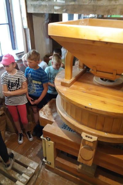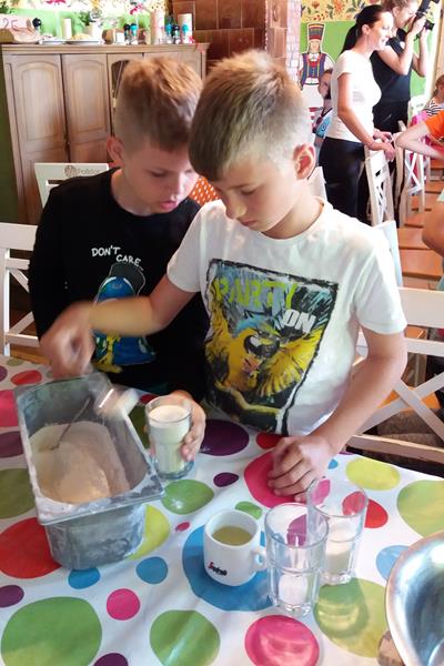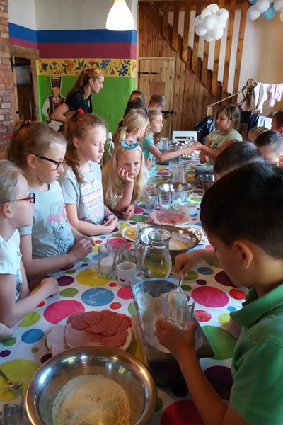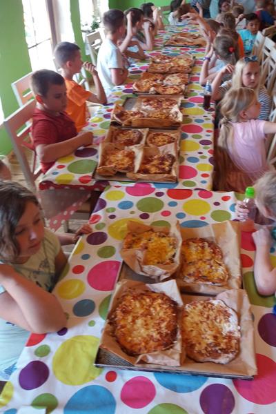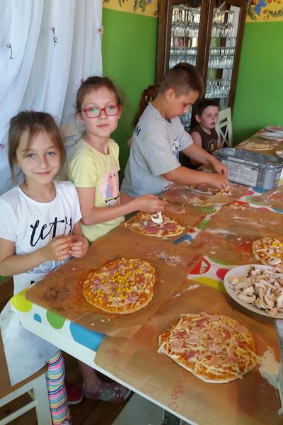 Wprowadzeniem do tematu była wizyta w młynie. Dzieci poznały różne rodzaje zbóż i ziaren, z których powstaje mąka. Następnie uczniowie podzieleni na pięcioosobowe grupy odmierzali i dodawali kolejne składniki, z których przygotowywano ciasto. Ogromną frajdę sprawiło uczniom samo wyrabianie ciasta. Po „wyrośnięciu” zostało ono podzielone na porcje, z których powstały 42 autorskie wersje tego przysmaku. W czasie, kiedy pizza przebywała w piecu, uczniowie korzystali z atrakcji na placu i sali zabaw.