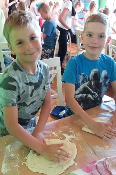 O tym, że ciekawe lekcje mogą odbywać się również poza murami szkoły, mogli się przekonać uczniowie klasy IIa i III, którzy wraz z wychowawczyniami p. Iloną Przydatek i p. Beatą Taracińską, w poniedziałek 29 maja wzięli udział w warsztatach pieczenia pizzy przeprowadzonych przez restaurację Folklor w Jastrowiu. Zajęcia zorganizowano w ramach realizacji innowacji pedagogicznej „Dzieciaki w kuchni”. W trakcie warsztatów uczniowie poznali proces produkcji pizzy, a następnie sami zamienili się w kucharzy i samodzielnie przygotowali swoją ulubioną pizzę.