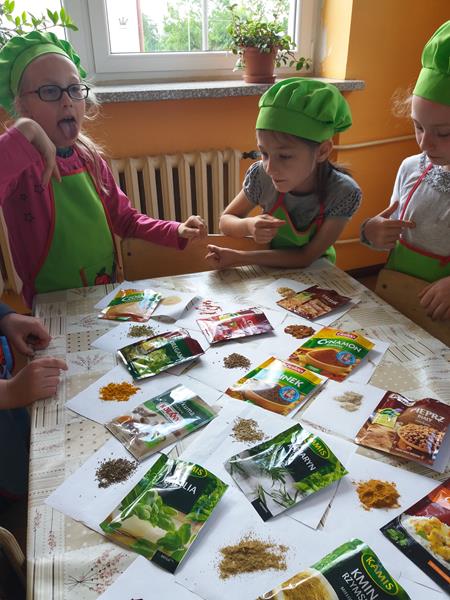 Podczas zajęć kulinarnych zorganizowanych w ramach realizacji innowacji pedagogicznej „Dzieciaki w kuchni”, uczniowie klasy II A i III poznali przyprawy, które wzbogacają smak, aromat i wygląd potraw. Mieli okazję poznać: liść laurowy, słonecznik, kokos, curry, pieprz biały, tymianek, czosnek, pieprz czarny, goździki, jałowiec, rozmaryn, kurkumę, gorczycę, estragon, paprykę, majeranek, sól, jałowiec, imbir, rodzynki, ziele angielskie, bazylię, gałka muszkatołową i oregano.