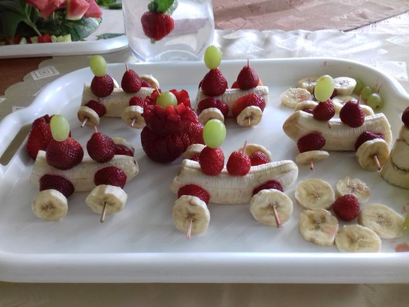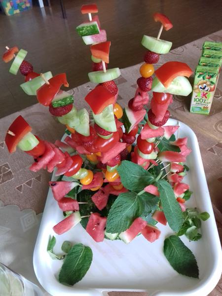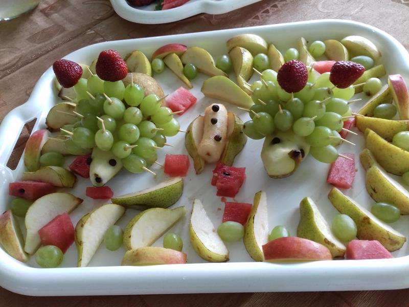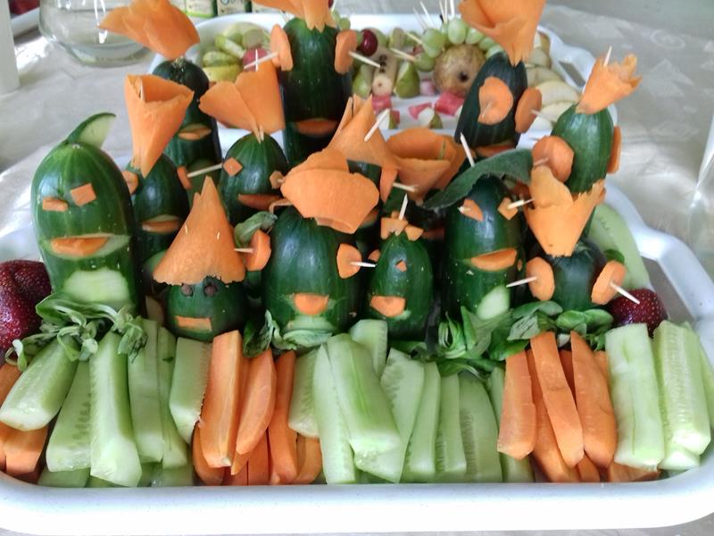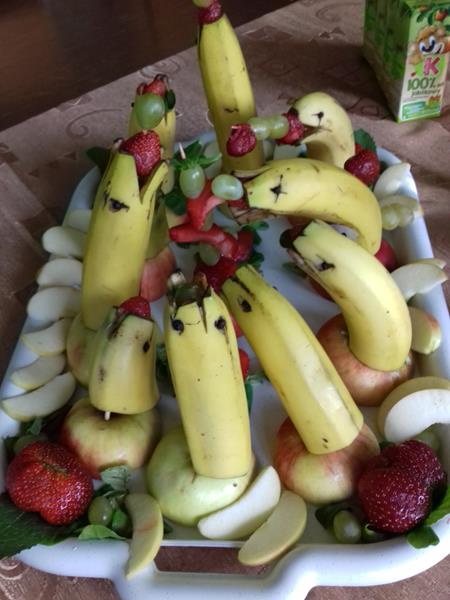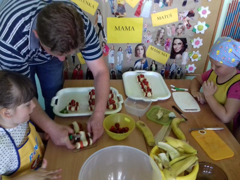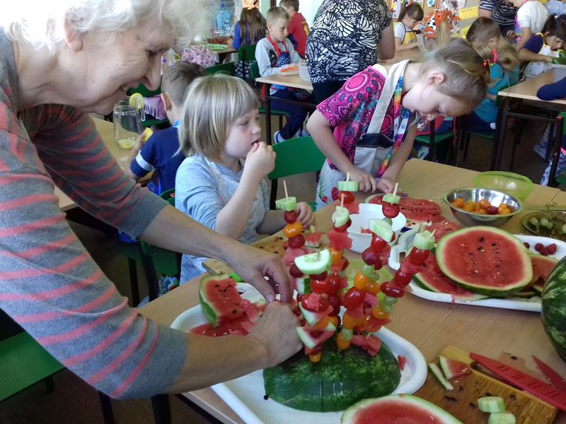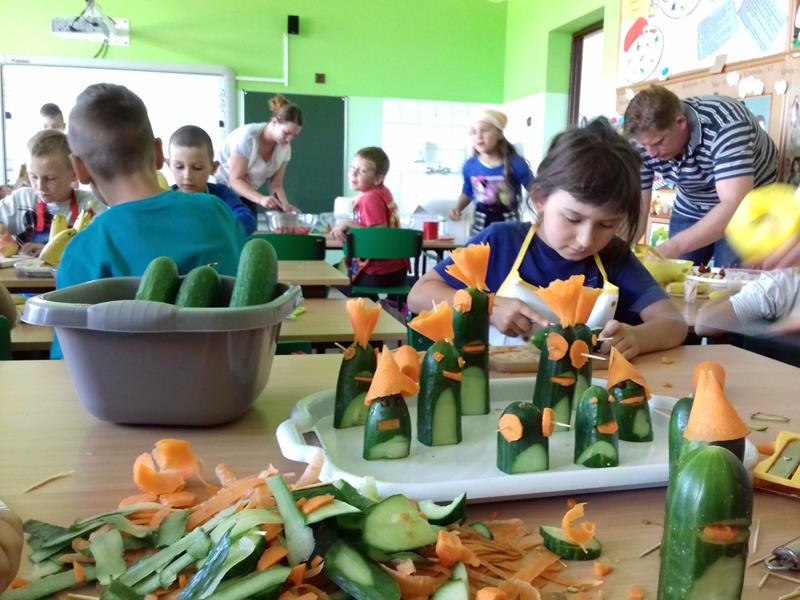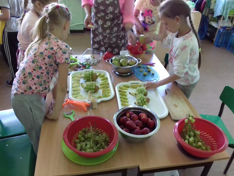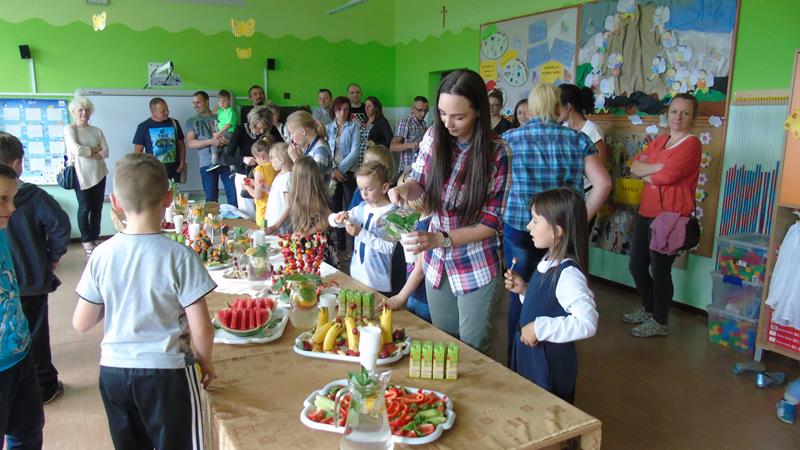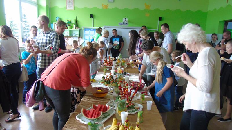 Wszyscy byli bardzo zadowoleni z efektu końcowego, gdyż stworzone smakołyki owocowo – warzywne przypominały rękodzieła. Po zakończonej pracy wszyscy wysprzątali klasę, rodzice ustawili ławki w jeden wielki stół, nakryli i postawili przygotowane przekąski. Były one pachnące, a swoim nietuzinkowym wyglądem zachęcały do degustacji, która niestety przewidziana była dopiero po południu.