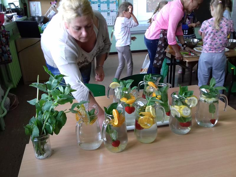 Uczniowie wraz z rodzicami podzieleni na grupy, wykonywali „cuda” z owoców i warzyw. Wszyscy solidnie przygotowali się do pracy, nie zapominając o przyborach kuchennych, fartuszkach, chustkach oraz wypielęgnowanych dłoniach. Przestrzegając podstawowych zasad higieny oraz bezpieczeństwa podczas przygotowywania posiłków, wykonali wspaniałe przekąski i orzeźwiające napoje. Wszystko przebiegało zgodnie z planem, a podczas pracy panowała niezwykle przyjemna atmosfera. Przygotowali: