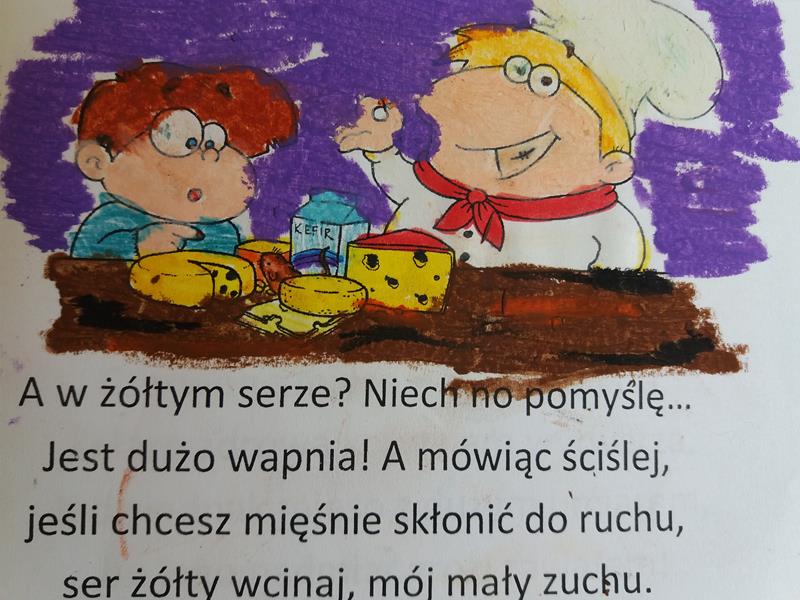 - A w żółtym serze? Niech no pomyślę… Jest dużo wapnia! A mówiąc ściślej, jeśli chcesz mięśnie skłonić do ruchu, ser żółty wcinaj, mój mały zuchu.