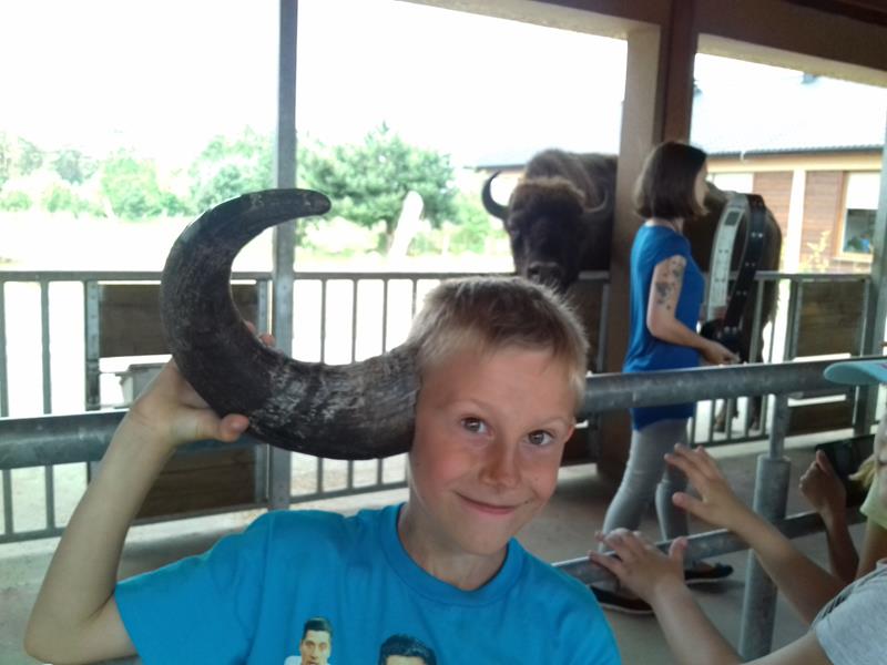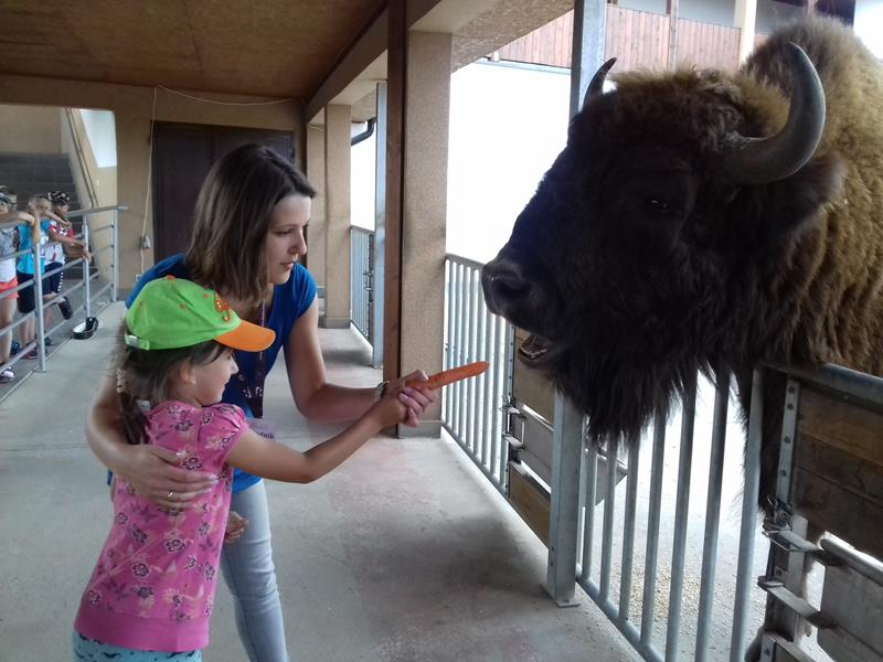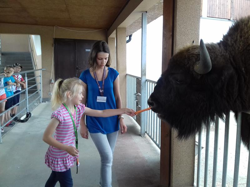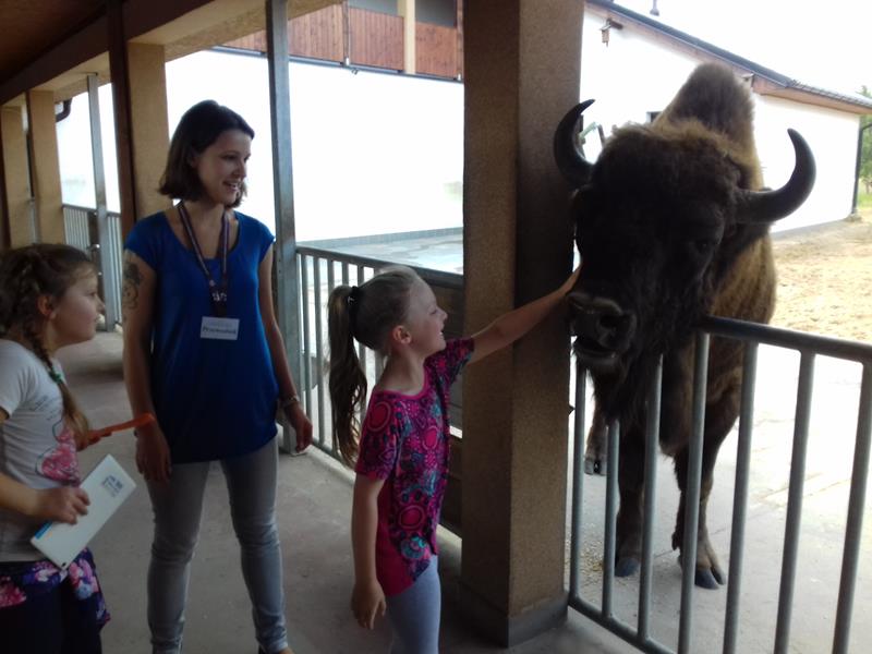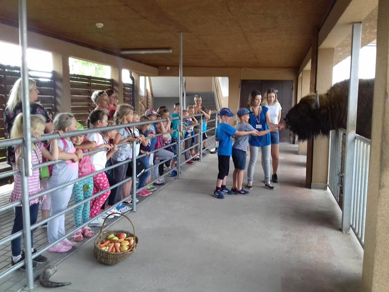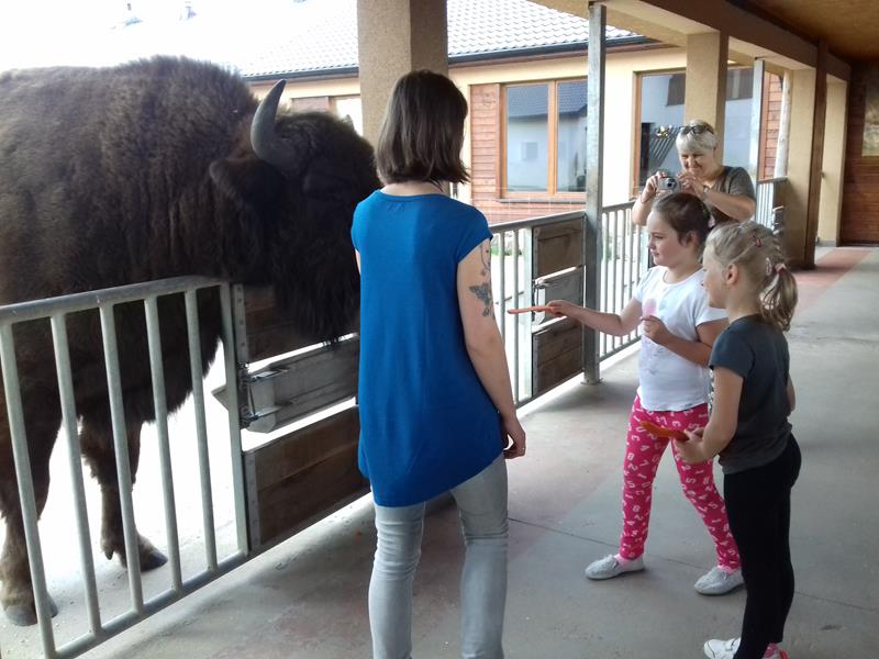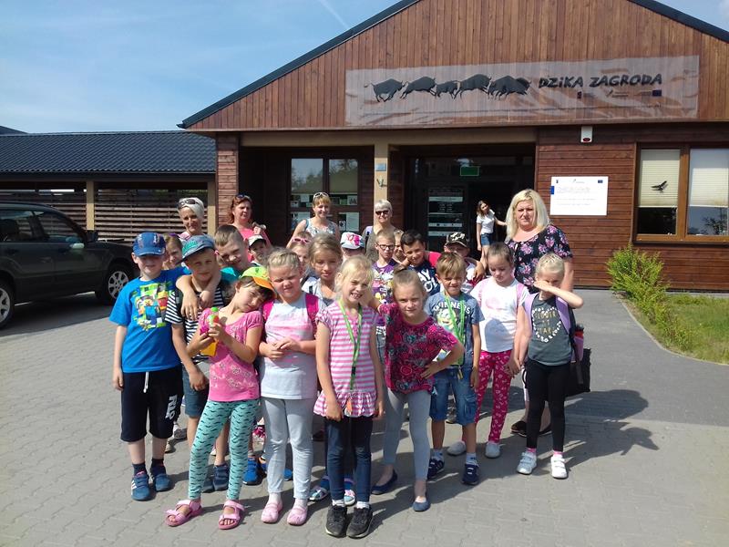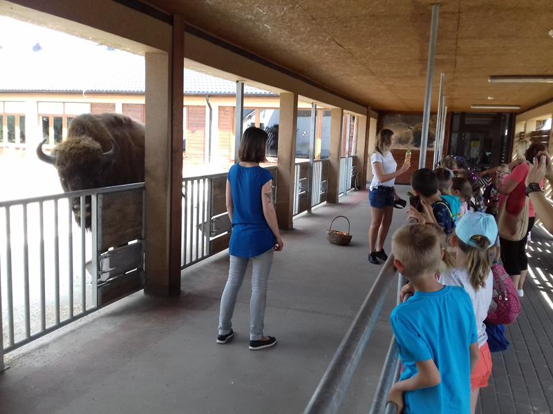 Żubr to największy ssak żyjący obecnie w Europie. Jest przykładem gatunku, który wyginął całkowicie w stanie wolnym, ale dzięki staraniom człowieka został przywrócony do środowiska. Początkowo uczestnicy wycieczki odwiedzili Popłocha, który jako jedyny został w zagrodzie i czekał na gości. Okazało się, iż krowy są cielne i oddaliły się do pobliskiego lasu – swojego naturalnego środowiska. Dzieci nakarmiły Popłocha przysmakiem, jakim są jabłka i marchew. Mogły z bliska obejrzeć i dotknąć żubra. Wysłuchały ciekawostek dotyczących życia tych niesamowitych zwierząt. Dowiedziały się, jak zmierzyć ich wysokość – od najwyższego punktu na grzbiecie zwanego – kłąb, wysokość dochodzi do 1,80 m. Zobaczyły też, jak wygląda i do czego służy obroża telemetryczna - zakłada się ją żubrom żyjącym na wolności w celu monitorowania ich wędrówek. Te poniekąd spokojne zwierzęta potrafią przynosić szkody rolnikom i wówczas są przepłaszane przez odpowiednie osoby w inne okolice. Wielu uczniów pierwszy raz w życiu widziało na żywo żubra. Wszyscy byli bardzo zadowoleni z tego niezwykłego spotkania i mieli nadzieją na spotkanie z rysiem, ale ze względu na nocny tryb życia, jaki prowadzi, ciężko było dostrzec go w ruchu. Okazało się, że zamieszkujące zagrodę dzikie koty spały i nie zechciały zaprezentować się gościom. Dzieciom udało się spotkać daniela, który zagubił się na ogrodzonej polanie i za wszelką cenę próbował się z niej wydostać na wolność. Na koniec wycieczki większość dzieci zakupiła sobie na pamiątkę drewniane zawieszki i kubki przedstawiające bohatera dnia. Podziękowały pracownikom Dzikiej Zagrody za gościnę i obiecały, że na pewno jeszcze tu zawitają.