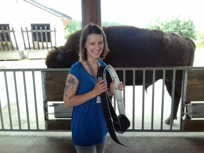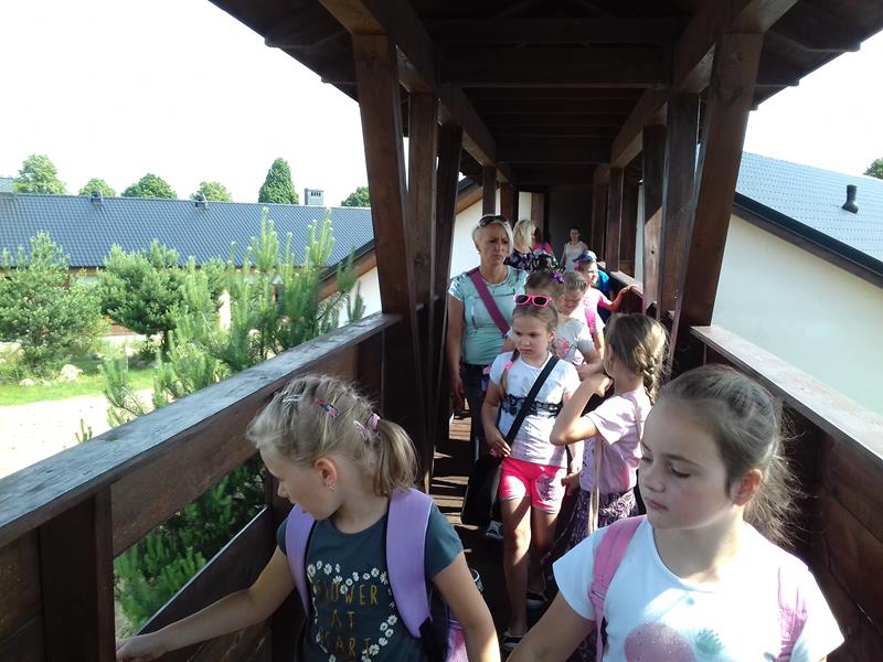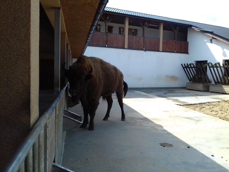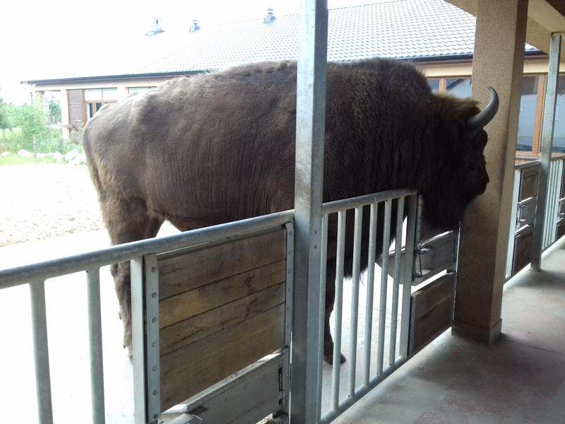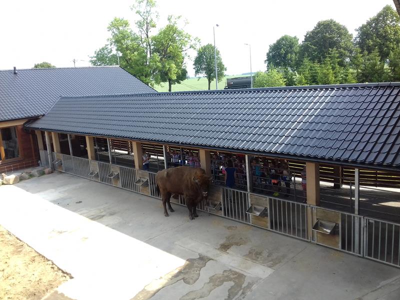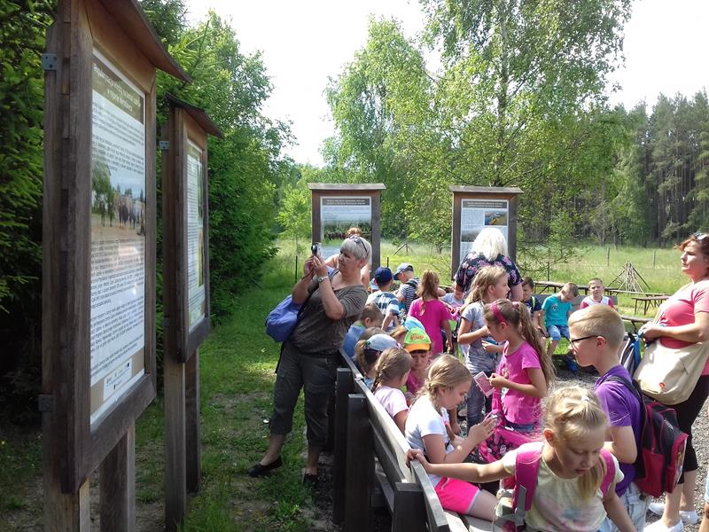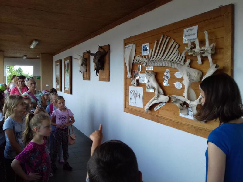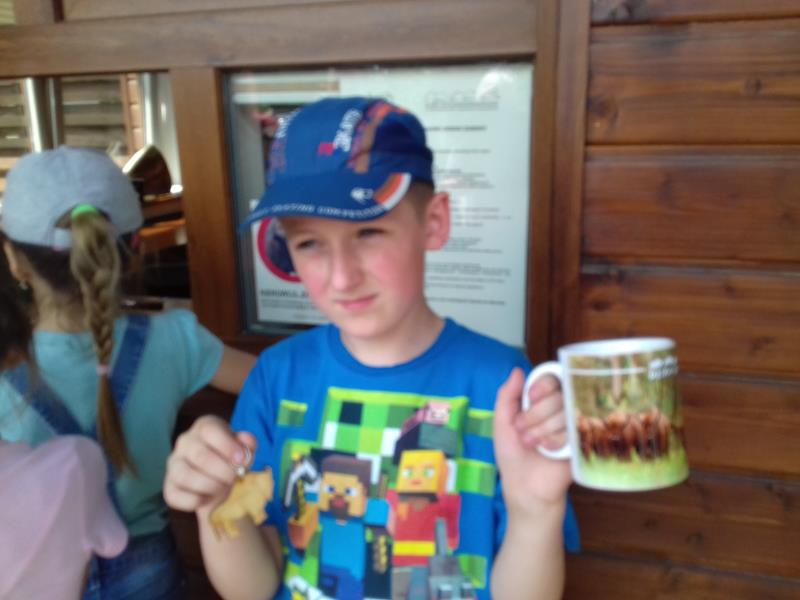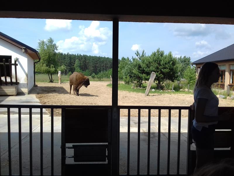 Żubr to największy ssak żyjący obecnie w Europie. Jest przykładem gatunku, który wyginął całkowicie w stanie wolnym, ale dzięki staraniom człowieka został przywrócony do środowiska. Początkowo uczestnicy wycieczki odwiedzili Popłocha, który jako jedyny został w zagrodzie i czekał na gości. Okazało się, iż krowy są cielne i oddaliły się do pobliskiego lasu – swojego naturalnego środowiska. Dzieci nakarmiły Popłocha przysmakiem, jakim są jabłka i marchew. Mogły z bliska obejrzeć i dotknąć żubra. Wysłuchały ciekawostek dotyczących życia tych niesamowitych zwierząt. Dowiedziały się, jak zmierzyć ich wysokość – od najwyższego punktu na grzbiecie zwanego – kłąb, wysokość dochodzi do 1,80 m. Zobaczyły też, jak wygląda i do czego służy obroża telemetryczna - zakłada się ją żubrom żyjącym na wolności w celu monitorowania ich wędrówek. Te poniekąd spokojne zwierzęta potrafią przynosić szkody rolnikom i wówczas są przepłaszane przez odpowiednie osoby w inne okolice. Wielu uczniów pierwszy raz w życiu widziało na żywo żubra. Wszyscy byli bardzo zadowoleni z tego niezwykłego spotkania i mieli nadzieją na spotkanie z rysiem, ale ze względu na nocny tryb życia, jaki prowadzi, ciężko było dostrzec go w ruchu. Okazało się, że zamieszkujące zagrodę dzikie koty spały i nie zechciały zaprezentować się gościom. Dzieciom udało się spotkać daniela, który zagubił się na ogrodzonej polanie i za wszelką cenę próbował się z niej wydostać na wolność. Na koniec wycieczki większość dzieci zakupiła sobie na pamiątkę drewniane zawieszki i kubki przedstawiające bohatera dnia. Podziękowały pracownikom Dzikiej Zagrody za gościnę i obiecały, że na pewno jeszcze tu zawitają.