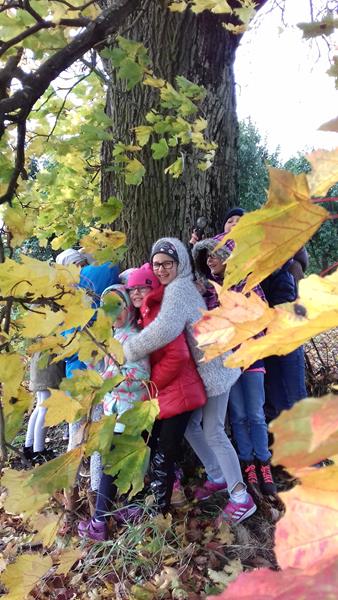 6. „Słuchamy drzew” - zabawy słuchowo-ruchowe, polegające na słuchaniu szumu liści, przytulaniu się do drzew i dotykaniu ich.