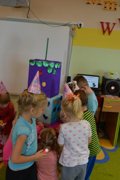 Po wspólnej lekturze przyszedł czas na zabawę. Żadne urodziny nie udałyby się przecież bez urodzinowego przyjęcia więc przyszedł czas na „małe co nieco”. Oprócz zabawy były różne zadania: przygotowanie urodzinowego tortu z kartonów i zdobienie go ciasteczkami, polewą i cukiereczkami z kolorowego papieru, zapalenie urodzinowej świeczki, złożenie misiom serdecznych życzeń i głośne odśpiewanie „Sto lat” dla Jubilatów. Były też zabawy ruchowe (posadź misia na swojej głowie, ukołysz misia, schowaj misia za plecami, zatańcz z misiem), przygotowanie portretów misiów z papierowych talerzyków i utworzenie galerii prac dzieci. Na zakończenie dzieci zaśpiewały piosenkę o misiu z misiem i dla misia. Urodziny zakończono podwieczorkiem - wylizywaniem miodku z ryżowych wafelków. To zadanie okazało się najsmaczniejsze.