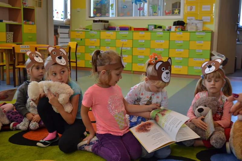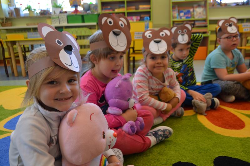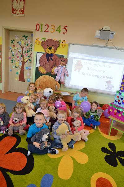 Ale kto mi powie dziś - w której książce mieszka miś?... Zajęcia rozpoczęły się od prezentacji książeczek, których bohaterami były rzecz jasna misie: od Kubusia Puchatka, Misia Uszatka, Paddingtona, aż po książeczkę z wierszami naszej pani bibliotekarki Wiesławy Pyrcz pt. „O misiach i niedźwiadkach”. Głównym wątkiem urodzin było głośne czytanie przygód wybranego misia-bohatera książkowego. Na imprezie nie mogło zabraknąć Jubilatów – książkowych i pluszowych Misiów, które każde dziecko przyniosło ze sobą do przedszkola. Odbyła się prezentacja pluszaków przez ich właścicieli.