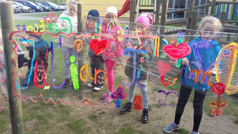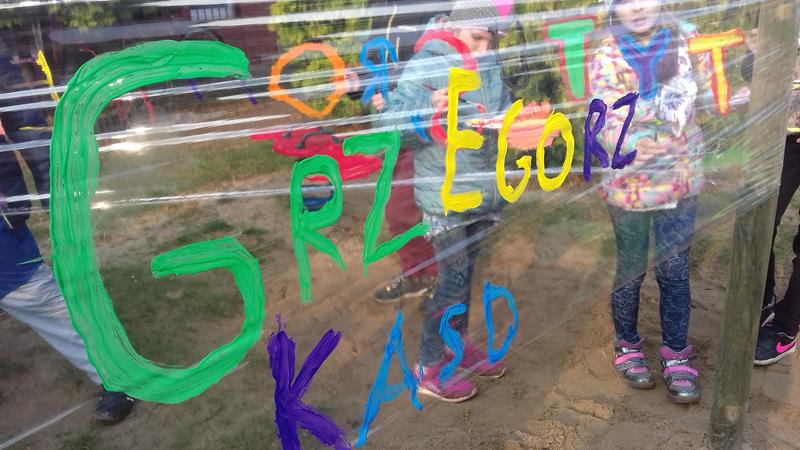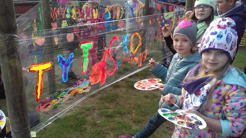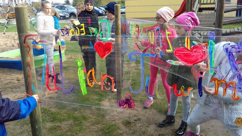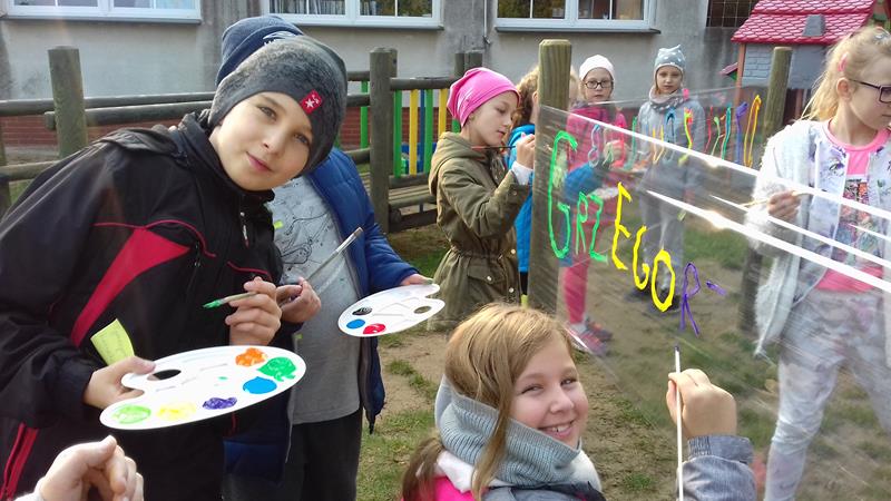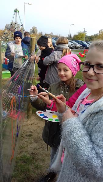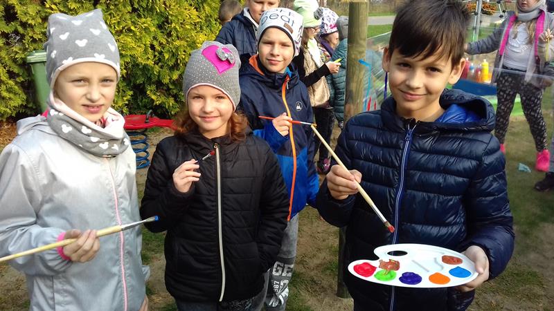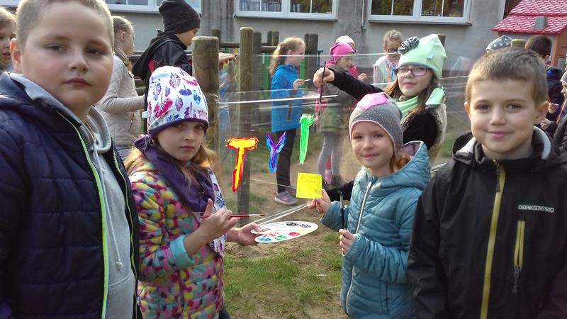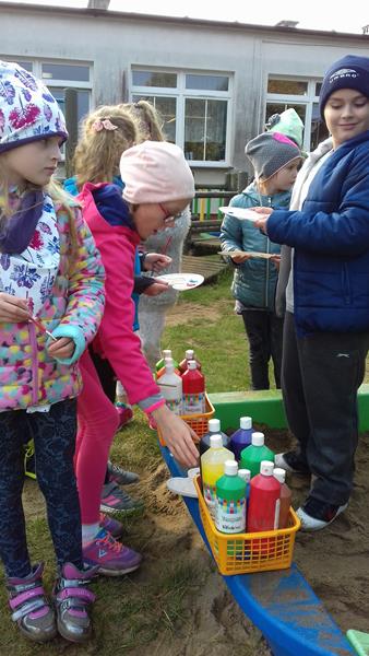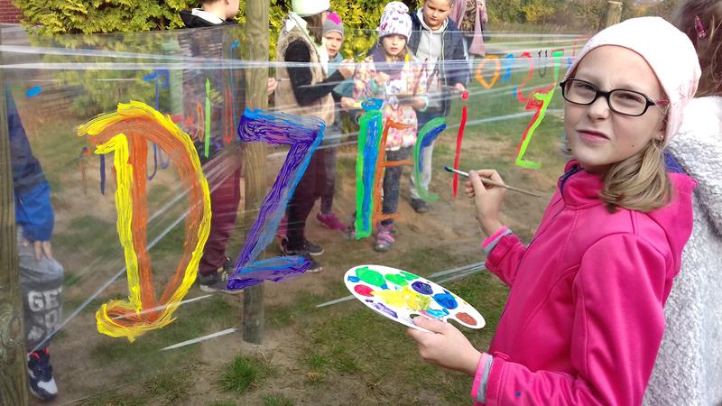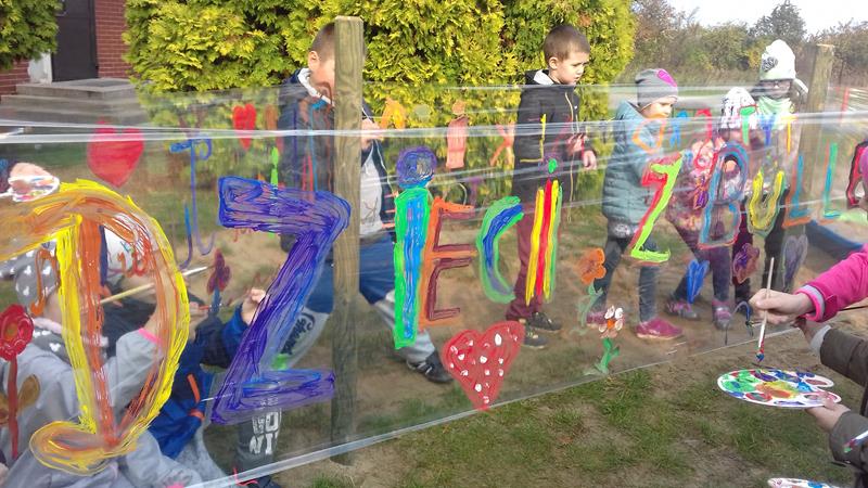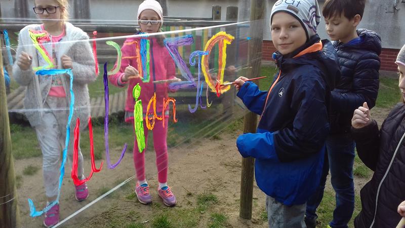 W ramach lekcji wychowawczej „Każde dziecko jest artystą” uczniowie zapoznani zostali z najważniejszymi terminami z zakresu sztuki ulicznej. Zaprezentowano też przykładowe malowidła, przybliżono historię graffiti, a także stworzono mapę pojęć związaną z tematem sztuki ulicznej. Po lekcji teoretycznej zajęcia przeniosły się na plac przedszkolny, gdzie na arkuszach folii spożywczej uczniowie malowali farbami przygotowane wcześniej napisy.