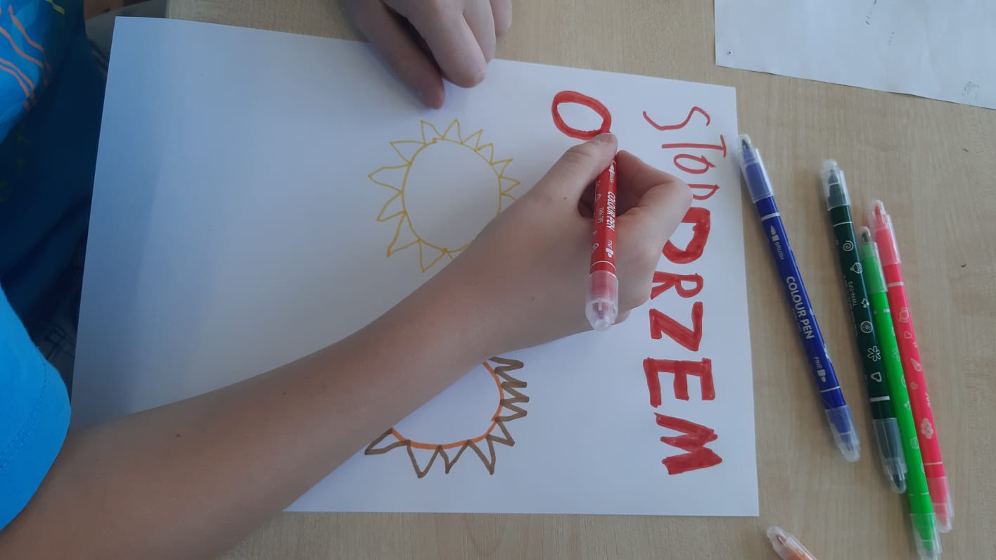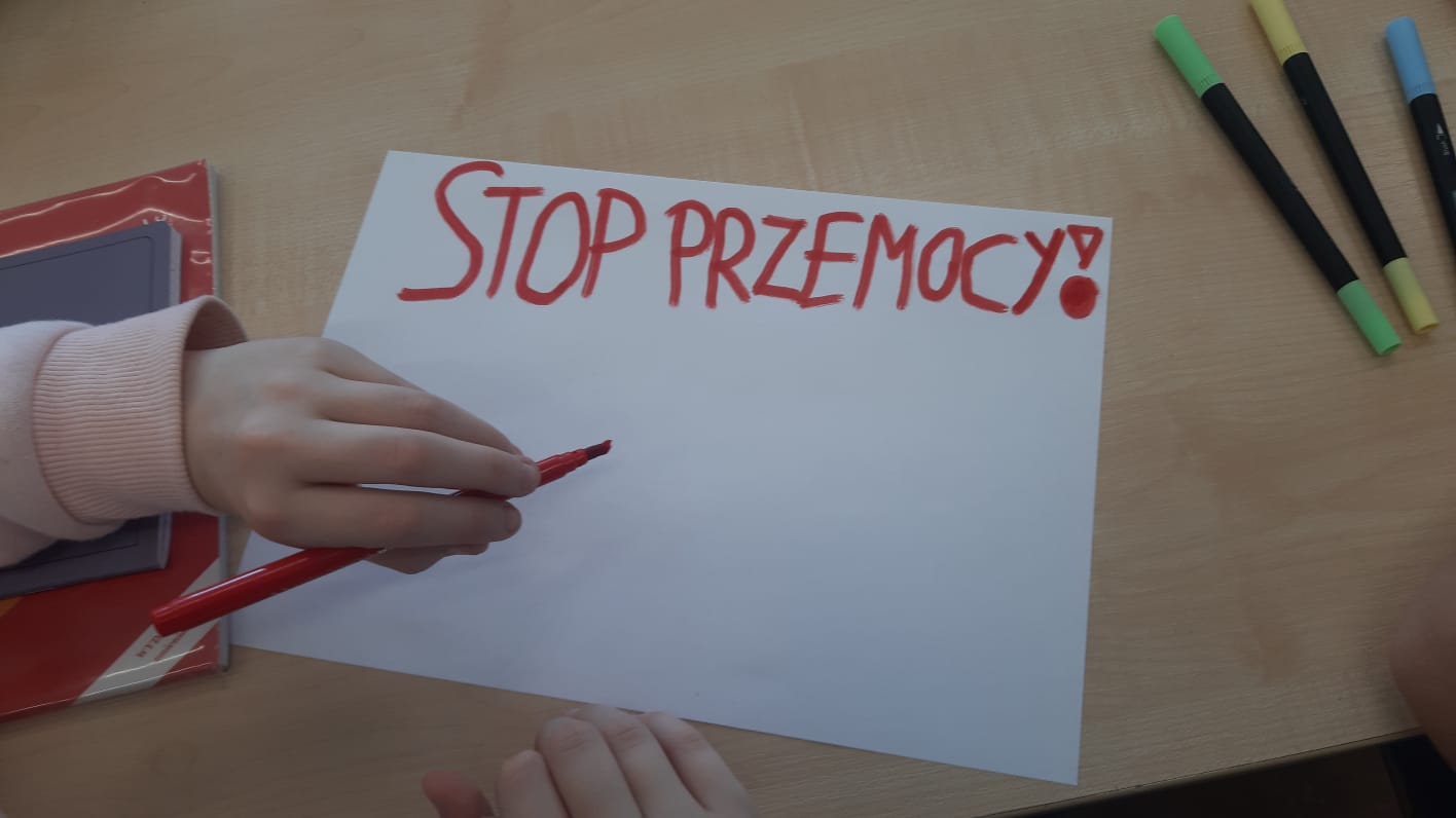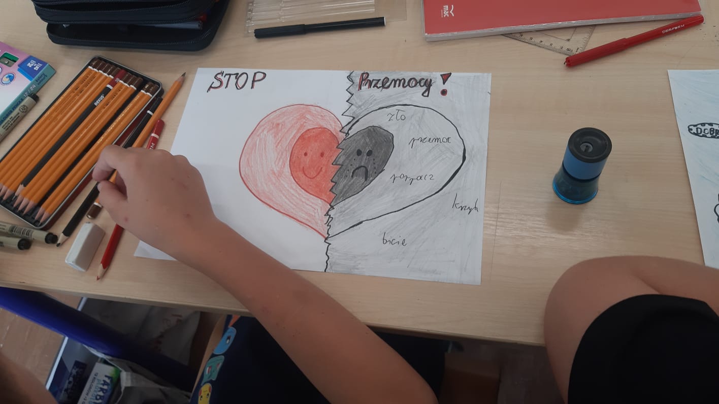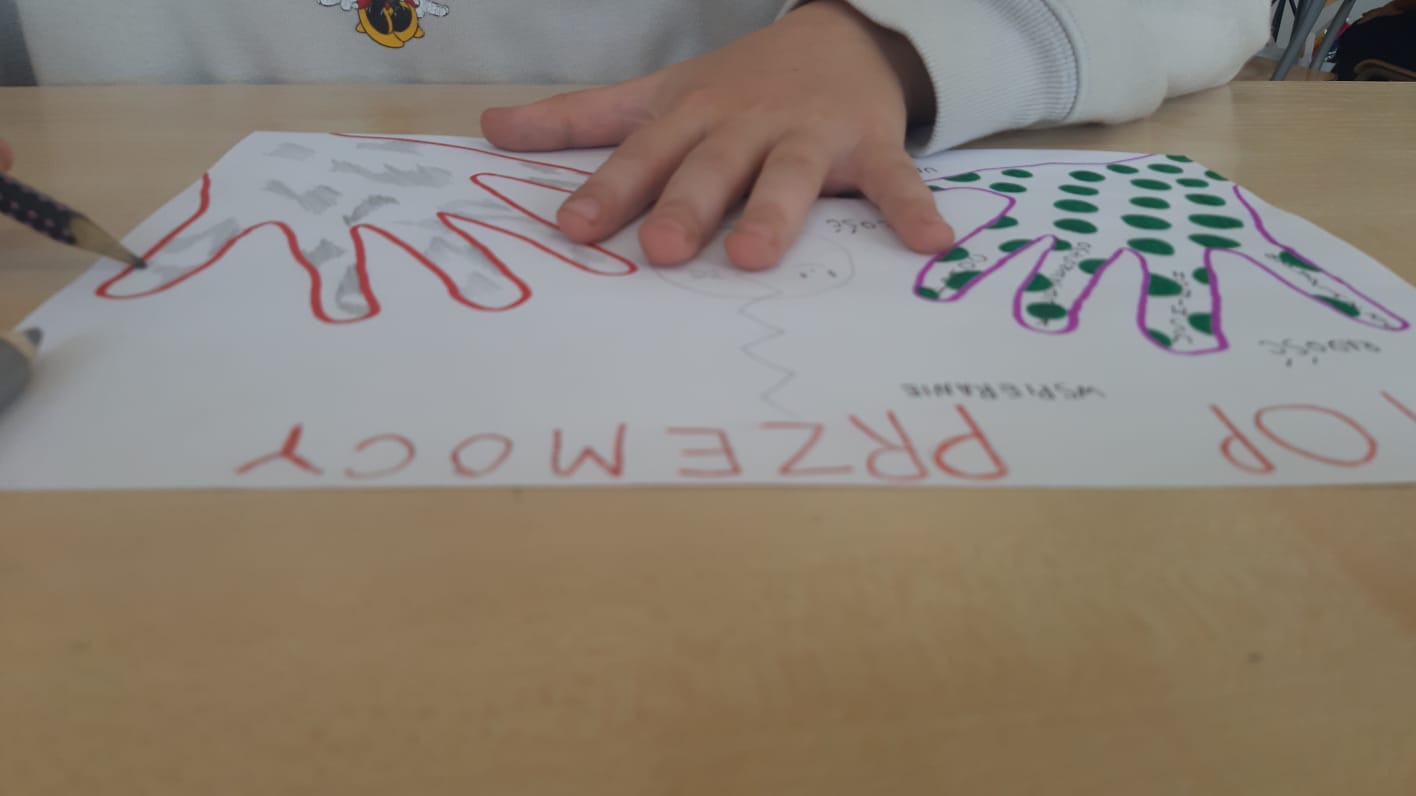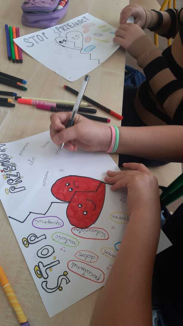 W klasie 4b obchodziliśmy Tydzień Przeciwdziałania Przemocy Rówieśniczej. Rozmawialiśmy o tym, czym jest przemoc i jakie mogą być jej formy. Zastanawialiśmy się, co ją powoduje i jak możemy jej zapobiegać – zarówno wobec siebie, jak i innych. Dużo uwagi poświęciliśmy emocjom – uczyliśmy się je rozpoznawać i wyrażać w sposób, który nikogo nie krzywdzi. Rozmawialiśmy też o tym, jak ważne jest reagowanie, gdy widzimy, że ktoś doświadcza przemocy – nie możemy być obojętni. Uczyliśmy się, jak szukać pomocy i do kogo można się zwrócić w trudnej sytuacji. Na zakończenie tygodnia wykonaliśmy wspólną pracę plastyczną oraz stworzyliśmy klasową gazetkę, która będzie nam przypominać, że przyjaźń, szacunek i bezpieczeństwo są najważniejsze.