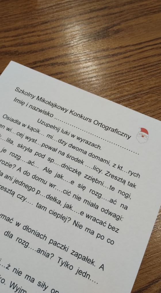 W naszej szkole odbył się konkurs ortograficzny inspirowany baśnią Hansa Christiana Andersena „Dziewczynka z zapałkami”.Uczniowie zmierzyli się z tekstem nawiązującym do losów bohaterki, w którym znalazły się liczne trudności językowe: wyrazy z „rz” i „ż”, pisownia łączna i rozdzielna oraz wyrażenia związane z realiami zimowej scenerii.Celem konkursu było nie tylko sprawdzenie znajomości zasad ortografii, lecz także przypomnienie wartości płynących z baśni – wrażliwości, empatii i potrzeby niesienia pomocy innym.