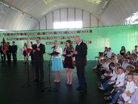 O godz.10.00 w sali gimnastycznej naszej szkoły odbyła się dalsza część obchodów nadania Zespołowi Szkół imienia Wł. S. Reymonta. Zaproszonych gości, rodziców oraz uczniów przywitali nauczyciele: Pani Agnieszka Cybulska i Pan Przemysław Przepiórkowski. Po wprowadzeniu pocztów sztandarowych ZS w Starej Łubiance i OSP w Starej Łubiance wszyscy zgromadzeni zaśpiewali hymn państwowy, a następnie zespół wokalny ,,Piasecka Band’’ wykonał poloneza.