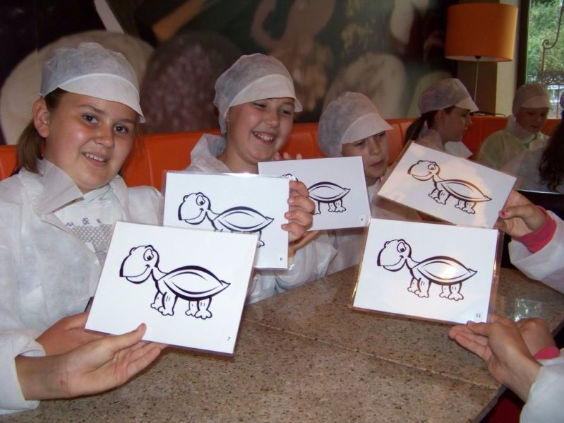 Wizyta rozpoczęła się od wykonania rysunku żółwia z trzech rodzajów czekolady-mlecznej, deserowej i białej. Okazało się, że malowanie czekoladą wymaga precyzji i koncentracji! Nie jest to łatwe zadanie!