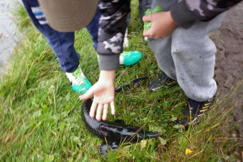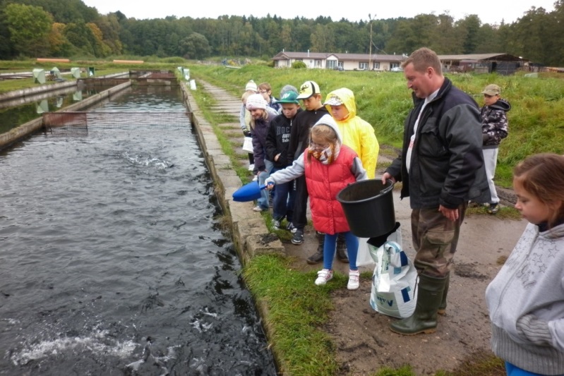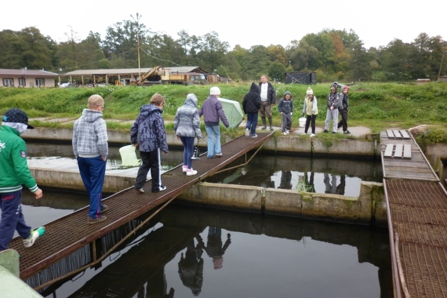 Przed wyjazdem ze szkoły przypomnieliśmy sobie zasady uczestnictwa w ruchu drogowym oraz podstawowe zasady bezpieczeństwa w czasie wycieczki. Ustaliliśmy także kolejność jazdy uczestników wyprawy - jedziemy jeden za drugim, na czele kolumny p. Anna Kotlarz, a na końcu p. Beata Taracińska. W trakcie jazdy podziwialiśmy piękno otaczającej nas przyrody – las w jesiennej szacie. Przy wjeździe do Tarnowa zastaliśmy Macieja , który poprowadził nas do swojego domu. A tam czekali już państwo Mackiewicz, którzy przywitali nas ciepłą herbatą i przepysznym ciastem! Degustowaliśmy też wędzone ryby! W cieple kominka gospodyni zabrała nas w podróż do Grecji ( od klasy II poznajemy państwa i stolice Europy). Pani Magda bardzo ciekawie opowiadała o przyrodzie i historii tego wspaniałego państwa. Mieliśmy wrażenie, że spacerujemy po Akropolu, teatrach greckich wraz ze wspaniałą przewodniczką. Ale to nie był koniec greckich atrakcji! Państwo Mackiewicz zadbali również o to, byśmy poznali smak greckich owoców: melona, rodzynek, fig, oliwek. Wiemy także jak wygląda bawełna. Kolejnym punktem naszej wizyty było poznanie pracy w gospodarstwie rybnym oraz zwiedzanie stawów rybnych. Pan Maciej oprowadzał nas po stawach, abyśmy poznali gatunki ryb hodowlanych (pstrąg, jesiotr) oraz etapy wzrostu tych ryb. Pomogliśmy karmić ryby, które tłumnie zjawiały się na posiłek. Trzymaliśmy w rękach małe jednoroczne oraz kilkuletnie jesiotry, a obserwowaliśmy jak pływają ogromne kilkudziesięcioletnie okazy. Dowiedzieliśmy się także, iż jesiotr należy do najstarszego gatunku ryb.