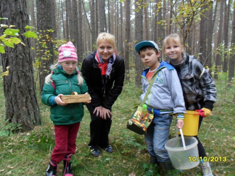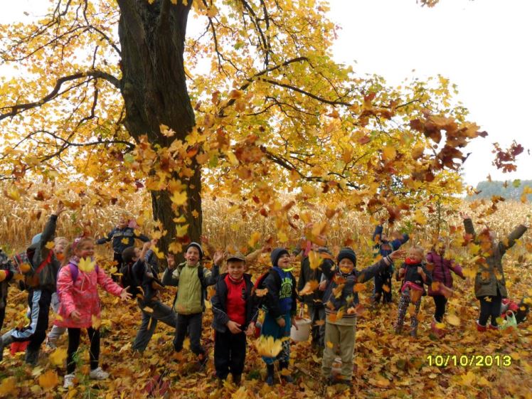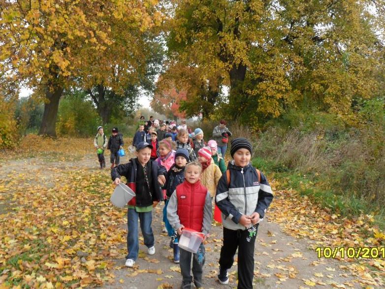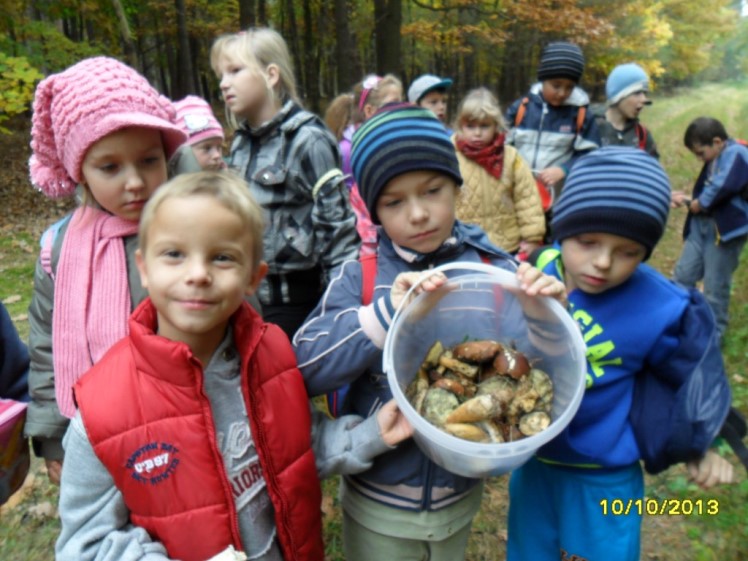 Tego dnia pogoda była wymarzona – królowała polska złota jesień. Do lasu prowadziła droga wyścielona liśćmi, przy której rosły potężne klony i jesiony. To właśnie one cieszyły oczy niesamowitymi barwami: złotym, żółtym, pomarańczowym, czerwonym, brązowym. Wycieczkowicze mijali też pola bogato porośnięte kukurydzą. W powietrzu unosił się niezwykle przyjemny zapach jesieni. Z lasu dobiegały odgłosy ptaków. Panie zrobiły uczniom krótką powtórkę dotyczącą warstwowej budowy lasu, zasad zachowania się w lesie oraz tego, jakie grzyby można, a jakich nie należy zbierać. Po krótkiej pogadance wszyscy ruszyli na poszukiwanie grzybów. Wkrótce koszyczki i wiaderka zaczęły się zapełniać.