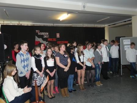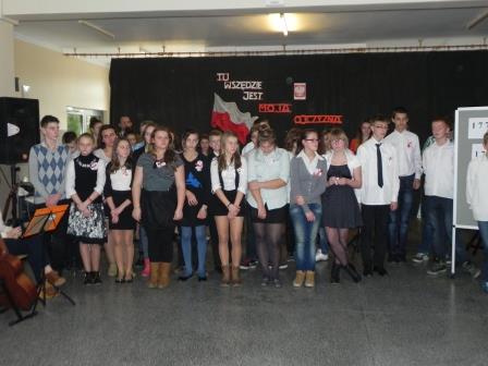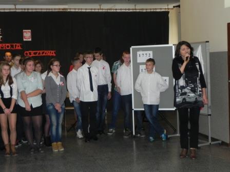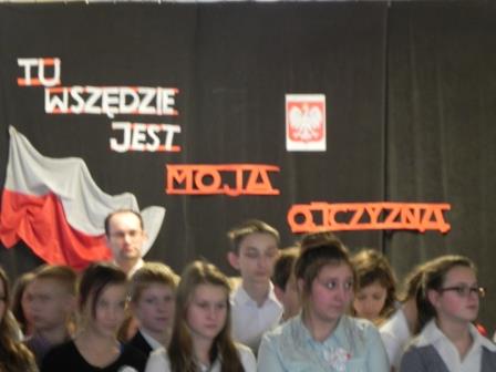 Klasa I gimnazjum miała zaszczyt przygotowania uroczystości dla społeczności szkolnej. Podczas apeli dla szkoły podstawowej i gimnazjum występujący uczniowie przedstawili najważniejsze daty z historii Polski, przypomnieli czasy zaborów, walkę o upragnioną wolność naszej Ojczyzny.