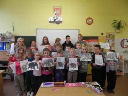 Dzieci aktywnie uczestniczyły w zajęciach, odpowiadały na pytania, a na koniec wszyscy kolorowali różne obrazki słoni, z których stworzona została wystawa. Na koniec zajęć zrobiono pamiątkowe zdjęcia.