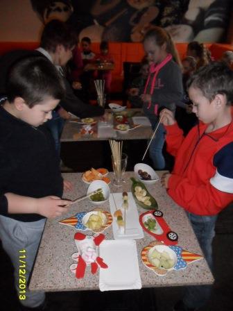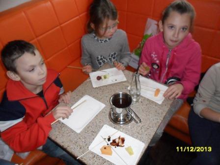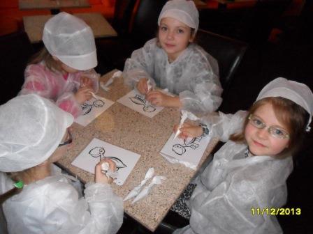 Dzieci uczestniczyły w warsztatach czekoladowych. Wizyta rozpoczęła się od pogadanki na temat składu i rodzajów czekolady oraz nauki techniki malowania czekoladą. Przed przystąpieniem do malowania uczniowie ubrali się w fartuchy i czapki. Wykonali czekoladowego żółwia z trzech rodzajów czekolady: mlecznej, deserowej i białej. Malowanie czekoladą wymagało siły dłoni do wyciskania czekolady z papierowego rękawa oraz precyzji i nie należało do łatwych zadań. Mimo tego wszyscy uczniowie dali radę, a wykonane przez nich prace stanęły do konkursu. Wszystkie były piękne i wyjątkowo słodkie, ale przydzielono następujące miejsca: IV - Weronika Karczmarek i Oliwia Bajer, III – Monika Kołodziejska, II – Kornelia Bednarek, I – Weronika Nawrocka. Dziewczęta otrzymały niezwykłe, czekoladowe nagrody.