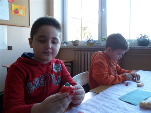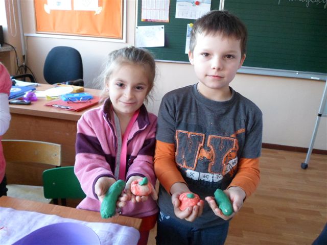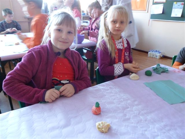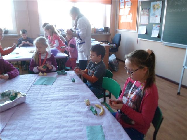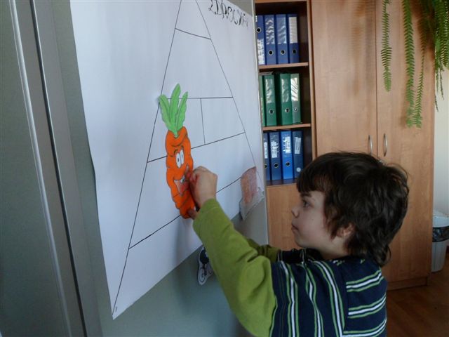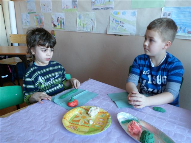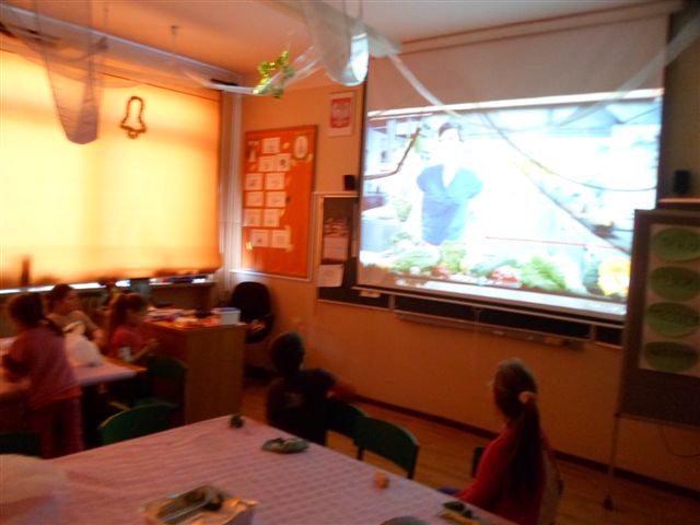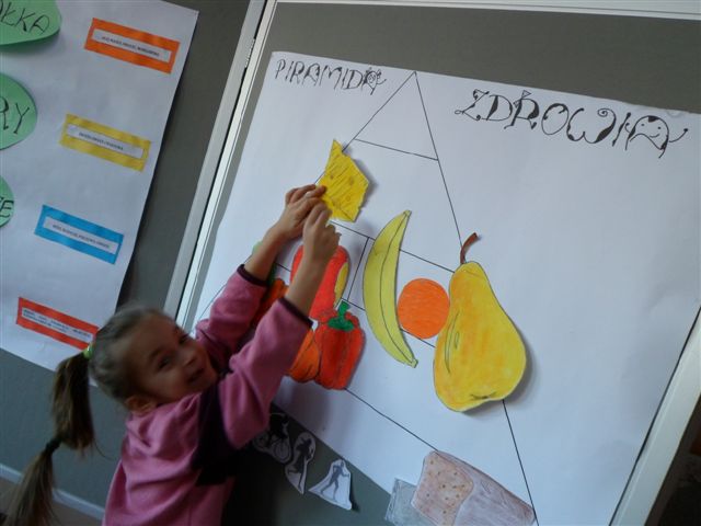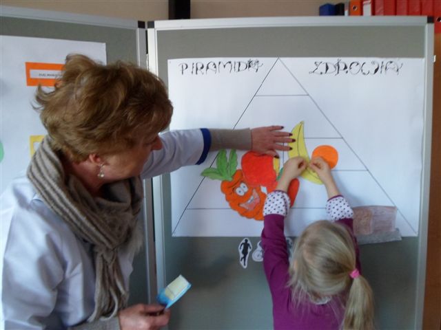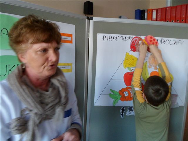 Dzieci chętnie współpracowały z panią pielęgniarką w prawidłowym uzupełnianiu piramidy zdrowia. Poza tym wykonywały owoce i warzywa z kolorowej masy solnej oraz obejrzały film traktujący o zdrowych nawykach żywieniowych.