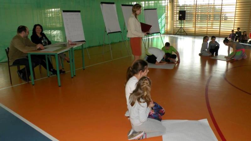 Po prezentacji plakatów, przyszedł czas na konkurencje. Pierwsze zadanie było zagadką, ponieważ należało przebić balon i wykonać wylosowane ćwiczenie. Było to, np. wykonanie 15 przysiadów, piruet, czy slalom z piłką.