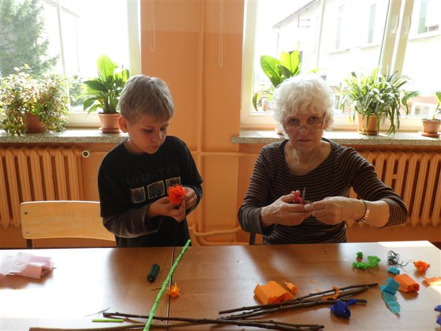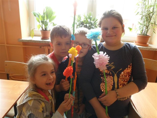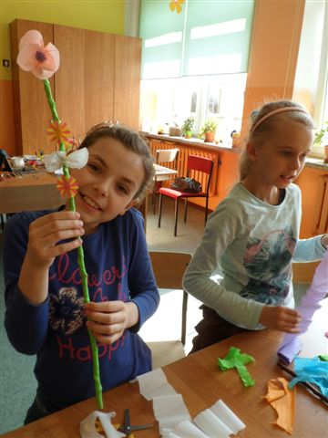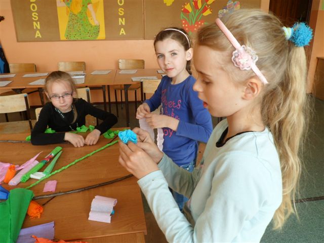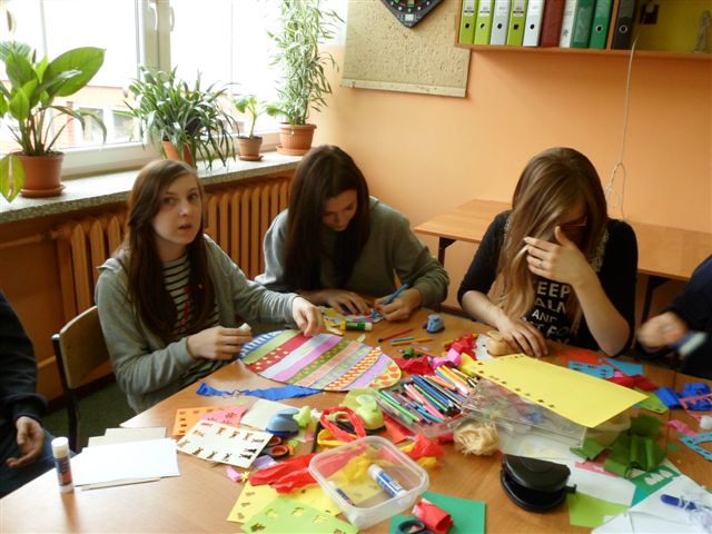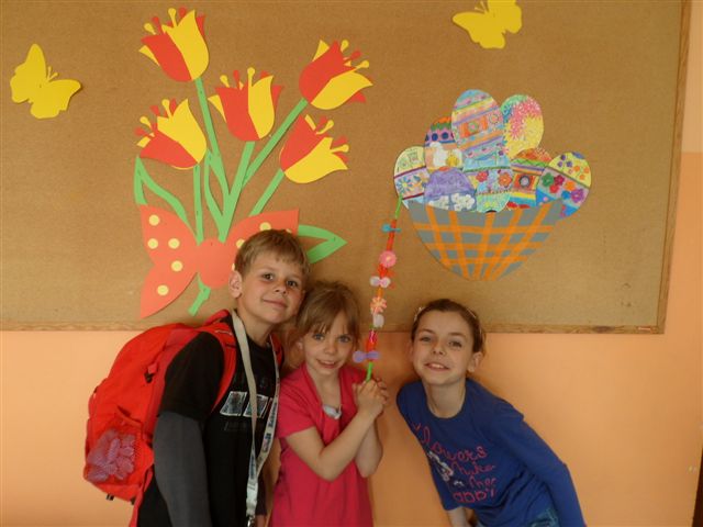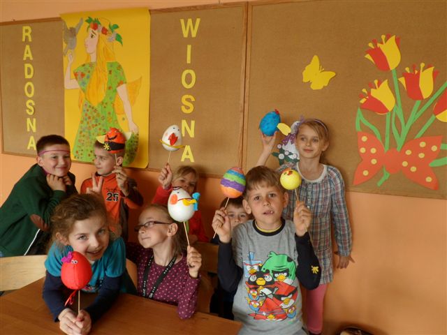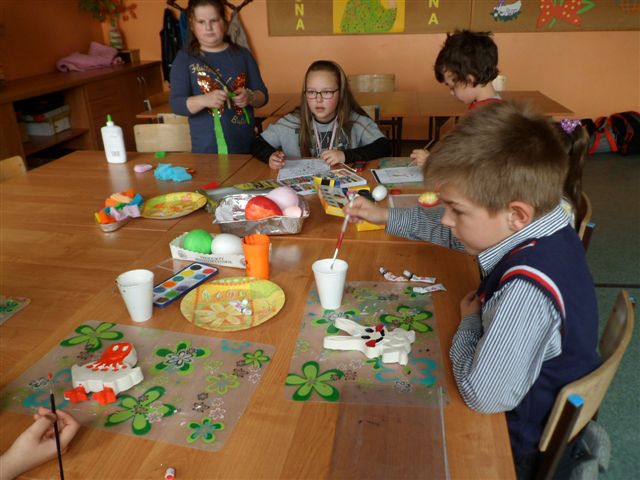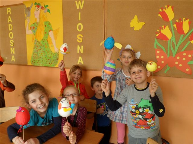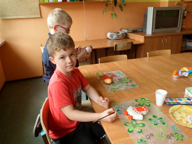 Tuż przed nadejściem Świąt Wielkanocnych wychowankowie naszej świetlicy wykonali wiele ciekawych ozdób, wśród których nie zabrakło kolorowych, kwiecistych palm, niepowtarzalnych pisanek, gipsowych zajączków, kurek i kogucików. Wszystkie prace „młodych artystów” gustownie zdobiły pomieszczenie świetlicy wprowadzając nas wszystkich w świąteczny czas.
