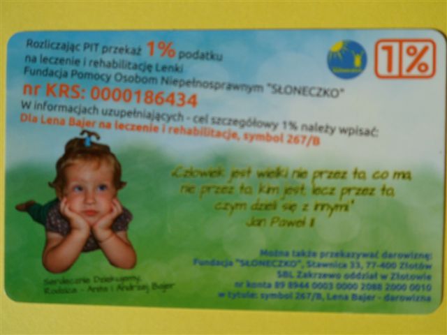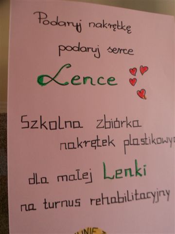 Cały czas trwa zbiórka plastikowych nakrętek dla małej Lenki Bajer z przeznaczeniem na turnus rehabilitacyjny dziewczynki. Uprzejmie prosimy wszystkich o włączenie się do akcji i dostarczanie nam plastikowych nakrętek. Włącz się i Ty, niech nikt z nas nie będzie obojętny. Bądźmy wszyscy „pozytywnie zakręceni”! Zapraszamy do udziału w akcji